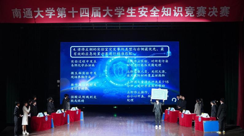 为进一步提升大学生安全意识与自我保护能力,营造安全、和谐、健康的校园环境,根据省教育厅相关通知要求,11月28日,我校在艺术中心剧场举办2025年大学生安全知识竞赛决赛。校党委常委、保卫部部长朱城,南通市消防救援支队副支队长李继军出席活动。