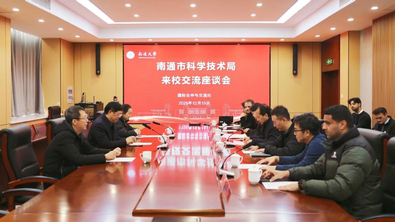 12月15日上午,南通市科学技术局副局长刘志刚、南通市外国专家局局长曹松一行来校交流。校党委副书记王卫东接待了来宾。王卫东对刘志刚一行表示欢迎,并介绍了学校近年来在国际化办学、外籍人才引进与管理等方面的总体情况与发展成效。他表示,我校始终秉持开放融合的办学理念,积极拓展国际交流渠道,持续优化外籍人才工作与生活环境,推动跨文化教学与科研合作深入开展。学校期待与南通市科技局进一步加强联动,共同构建更加完善的外籍人才服务与保障体系,助力校地产学研融合与国际合作迈上新台阶。刘志刚高度评价了我校在国际合作与外籍人才工作中取得的积极进展。他表示,南通市科技局高度重视外籍人才在南通的发展,将不断优化服务保障