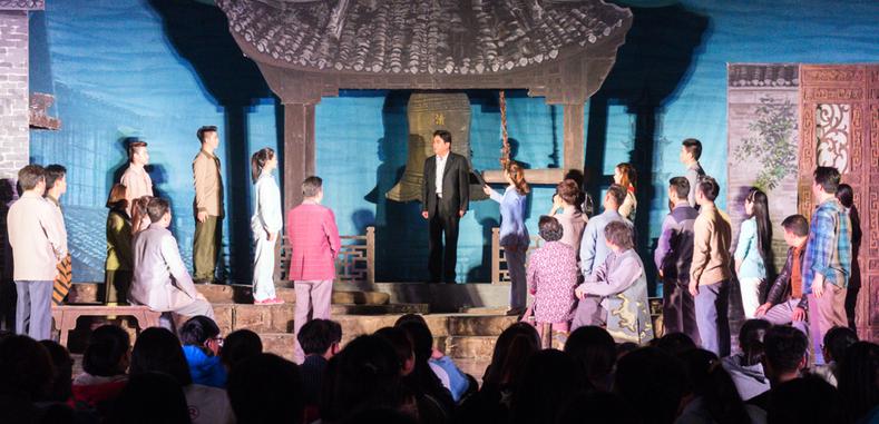 4月9日晚,由江苏省委宣传部、江苏省教育厅主办的江苏戏曲名作高校巡演走进通大校园,江苏省淮剧团为我校师生带来大型原创现代淮剧《小镇》。大学生活动中心座无虚席,700余名师生共赴这场叩问人性的文化盛宴。《小镇》以江南小镇为背景,将传统淮剧艺术与当代生活相结合,讲述了一个民风淳朴、宁静和谐的千年小镇因为500万元的悬赏而骤起波澜,一向广施善行的朱文轩被认定为当年救助企业家的人,而恰在此时他的儿子朱小轩因遇急难,急需500万巨款,朱文轩在妻子劝说下最终谎称自己是施救者,但同时认领悬赏的还有四个人,真正的施救者朱老爹没有当场揭穿朱文轩,而是在朱文轩悔过后让他认领悬赏以挽回小镇声誉。但朱文轩在经过激烈的思想斗争后最终选择坦白一切,不仅救赎了自己,也救赎了小镇,更救赎了自古传承的可贵精神。从小乡镇折射现代大社会,悬念迭起的剧情、生动的戏曲语言、浓郁的生活气息深深打动了现场观众,赢得了阵阵掌声。据悉,该剧由“新世纪杰出导演”卢昂执导,并曾荣获第十五届中国文化艺术政府奖文华大奖。剧中陈明矿(饰男主角朱文轩)、陈澄(饰女主角薛小妹)等主演曾获中国戏剧表演艺术最高奖——梅花奖、上海戏剧“白玉兰”奖等奖项。