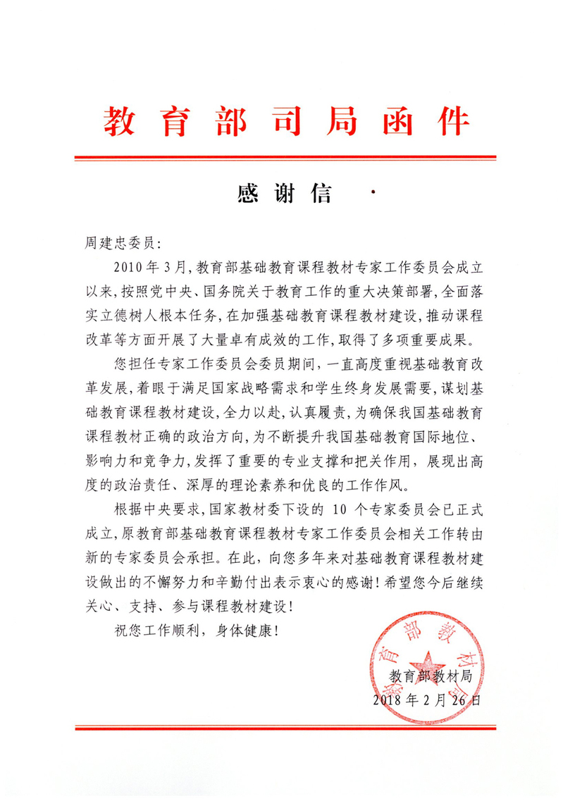 近日,教育部教材局来信,感谢我校周建忠教授对我国基础教育改革发展作出的贡献。