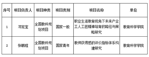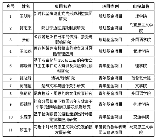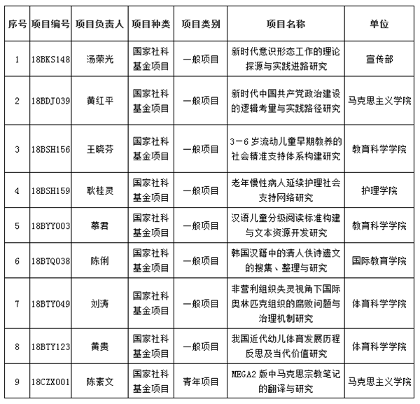 近日,2018年度国家社科基金项目、全国教科规划项目评审结果相继公布,我校共有11个项目获立项资助,总立项数位居全省高校第9位。其中9个项目获得国家社科基金项目立项,2个项目获得全国教科规划项目立项。全国教科规划项目立项数在全省高校位居第5位,在全国高校中排名第40位。