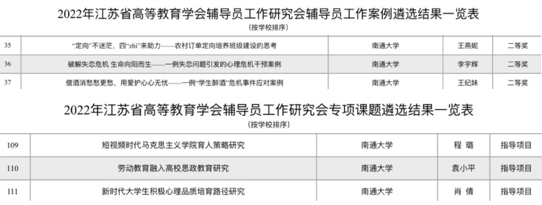 近日,江苏省高等教育学会辅导员工作研究委员会公布了2022年辅导员工作案例遴选和专项课题立项结果,我校3个工作案例获得二等奖,3项课题获批立项。
