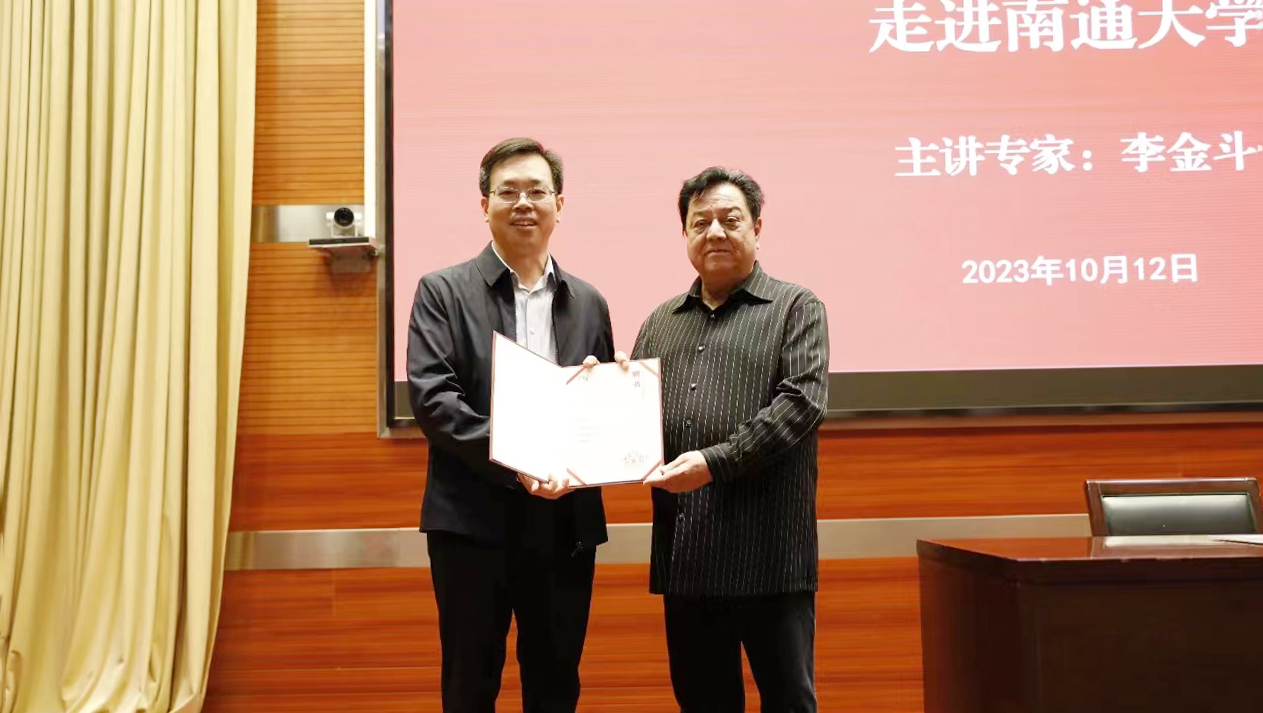 10月12日晚,由我校艺术学院、通州区文旅局、通州区文化馆共同承办的“曲艺名家进校园”活动邀请到著名相声表演艺术家、国家一级演员、全国曲艺表演场所协作发展联盟主席李金斗先生来校做讲座。校党委常委、副校长施佺在活动中致辞,并向李金斗颁发“南通大学客座教授”聘书。