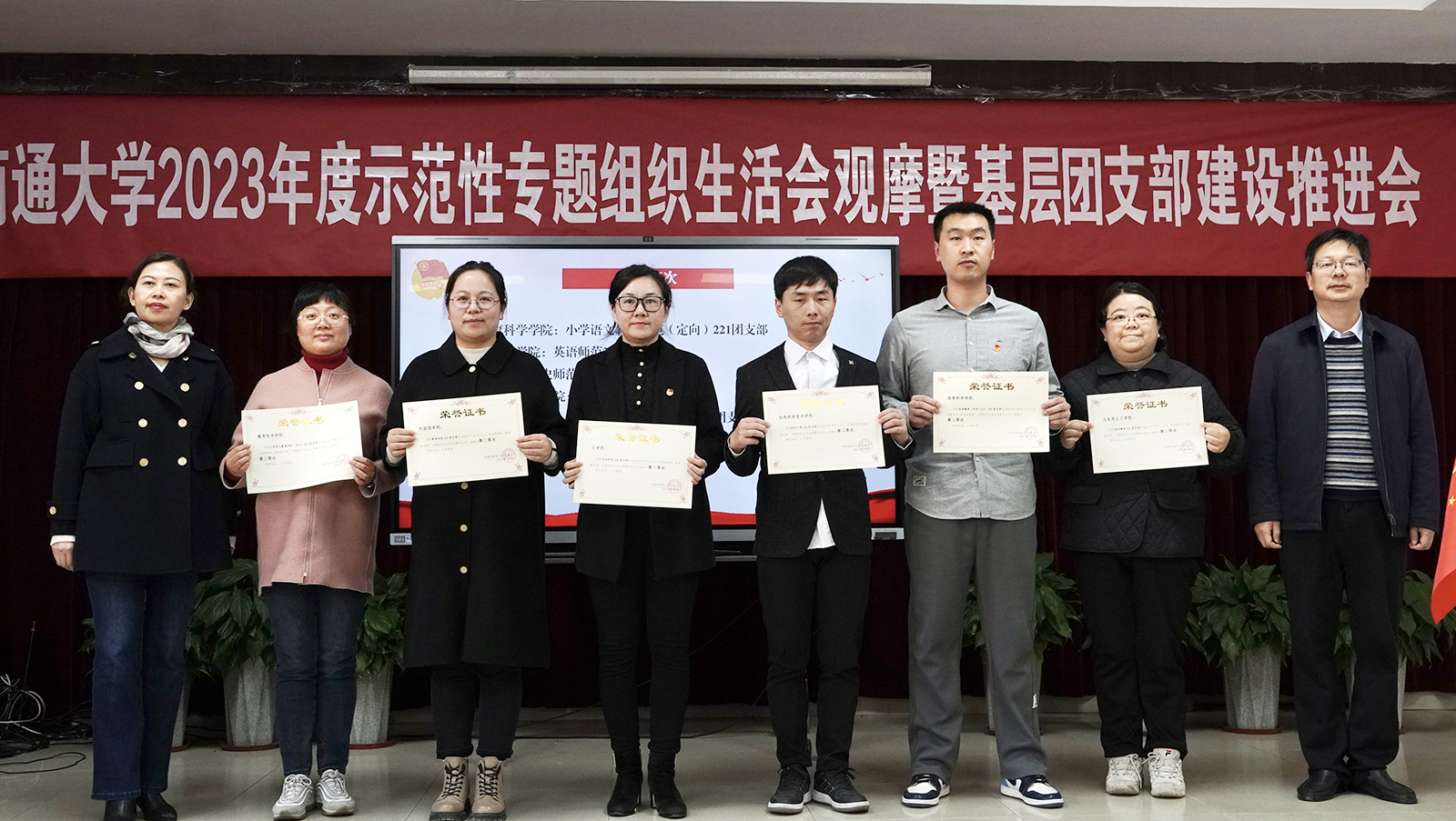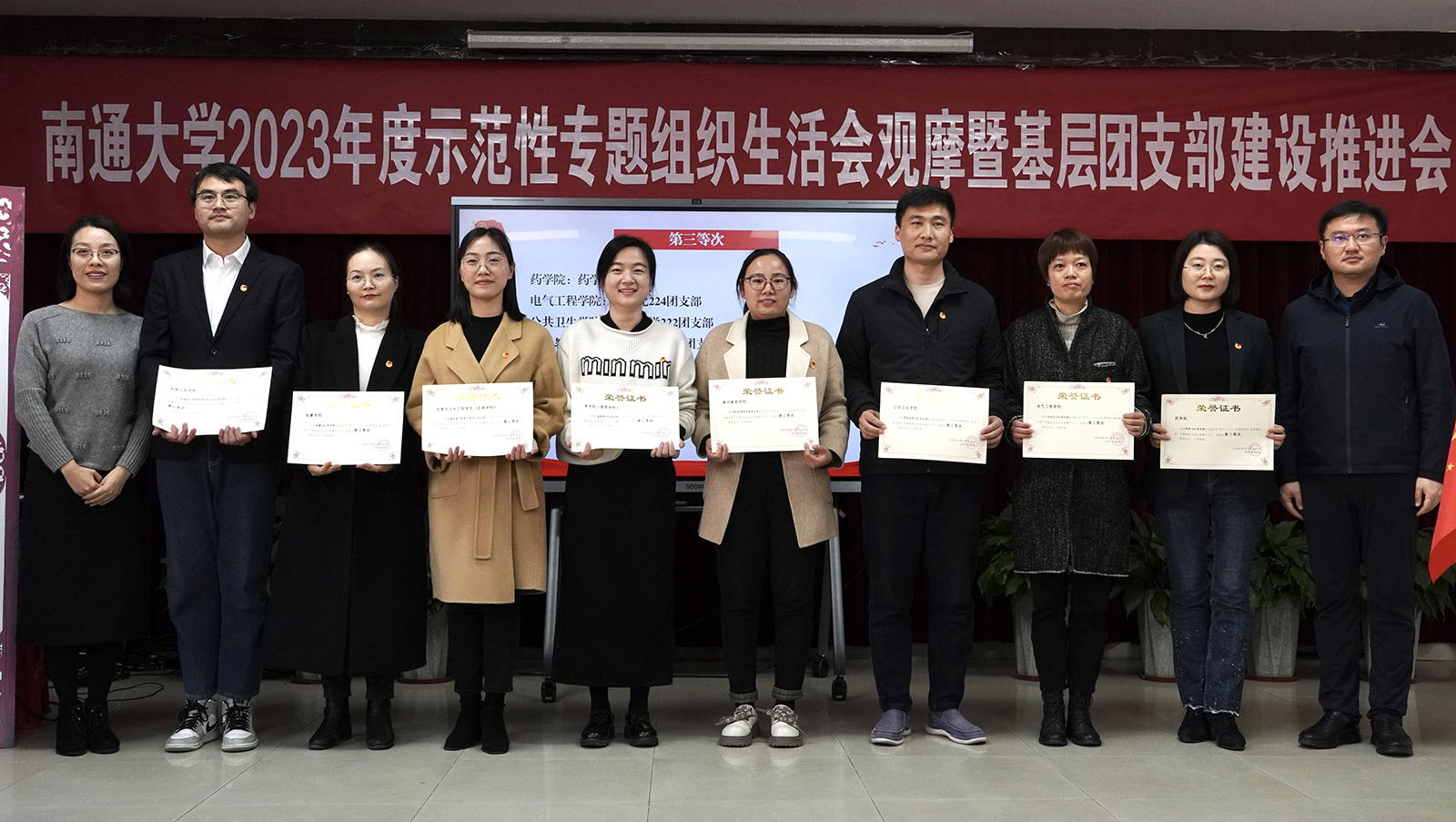 会上,校团委书记陈婷婷宣读了《关于公布南通大学2023年度示范性专题组织生活会观摩结果的通知》。与会领导为获得第一、二、三等次的团支部颁发证书。医学院(护理学院)临床2211团支部作为本次观摩活动的第一名进行了现场示范性组织生活会展示。