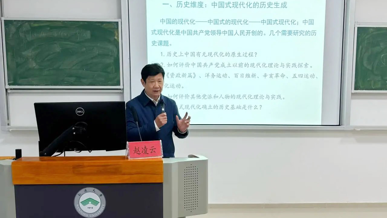 赵凌云教授以《深化中国式现代化研究的四个维度》为题,就目前学术界对中国式现代化在政治性、政策性层面的研究进行了解读与阐述,并从历史维度、理论维度、比较维度、实践维度这四个维度系统全面地阐释了中国式现代化的历史生成、内涵与外延、共性与特性、实践与拓展。他指出,广大师生需要加强学理性研究,在已形成的中国式现代化理论基础上构建中国式现代化学术体系,使之成为一个学理性范畴。
