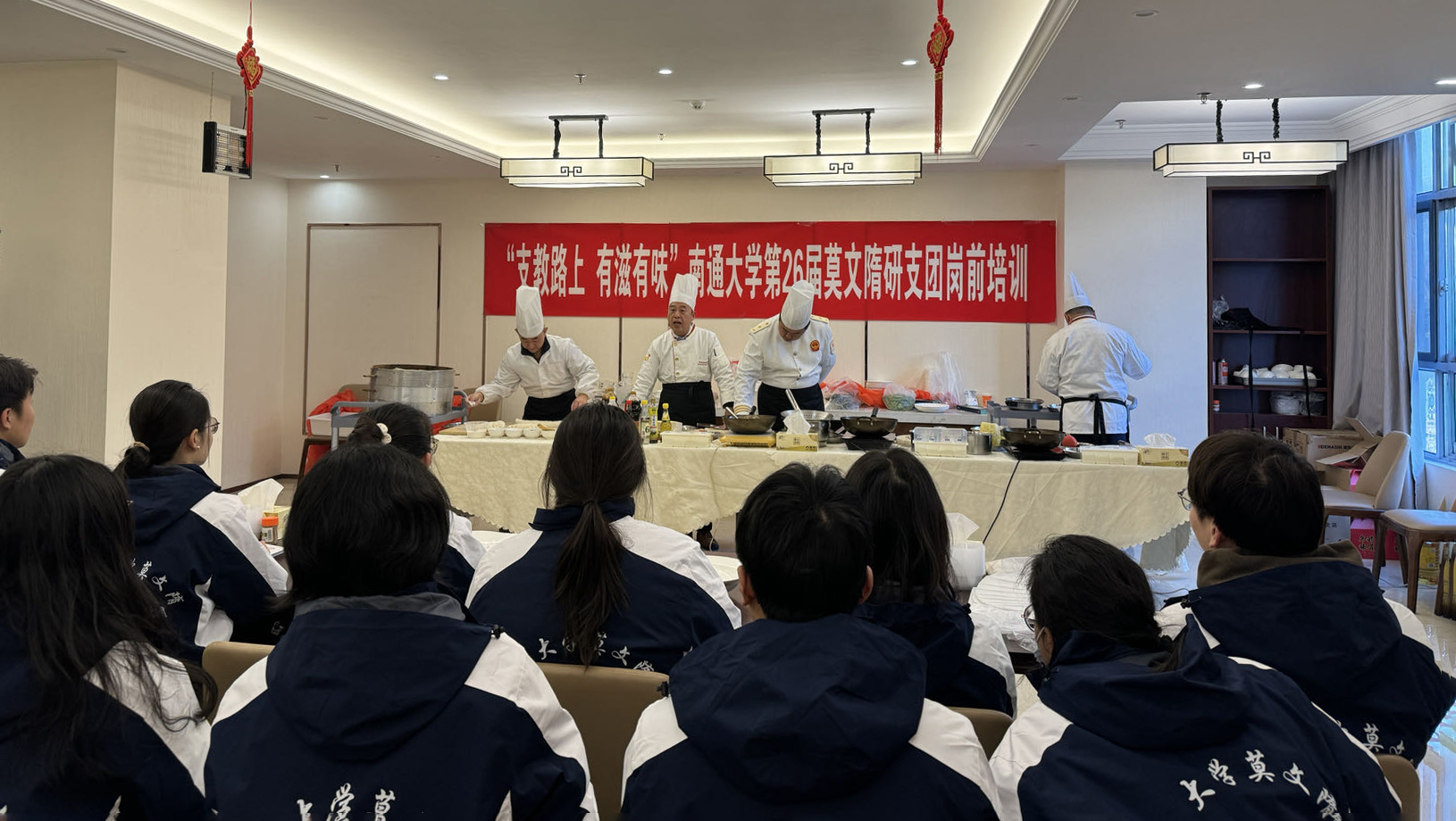 培训活动中,来自后勤保障部的钱华、单春明、陆迎接、王传瑜等四位烹饪高级技师和特技厨师组成培训教师团队,向研支团的志愿者们讲授授常见食材的特性,演示葱花卷、宫保鸡丁、大煮干丝等菜肴的制作,并指导志愿者们进行现场实操。后勤保障部还精心准备了菜谱,现场赠送给即将出征的志愿者们,让志愿者们带着“家乡的味道”踏上支教的路途,让同学们远在他乡也不会感觉孤单,全身心投入支教事业。。