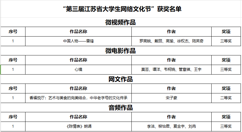 第三届江苏省大学生网络文化节设立微视频、微电影、动漫、摄影、网文、公益广告、音频、校园歌曲、其他类网络创新作品等9类作品类别;高校网络教育优秀作品推选展示活动设立优秀网络文章、优秀工作案例、优秀微课、优秀新媒体作品等4类作品类别。省委教育工委、省教育厅自2020年启动“一节一推选”活动以来,我校积极推进网络文化作品创作生产,丰富网络文化内容供给,广泛发动师生参与,连续三届取得佳绩。