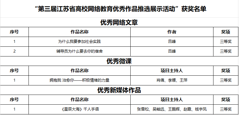 近日,第三届江苏省大学生网络文化节和高校网络教育优秀作品推选展示活动遴选结果公示。我校师生作品获得二等奖1项、三等奖7项,侯昀彤老师获“第二届江苏省大学生网络文化节优秀指导教师”荣誉称号。