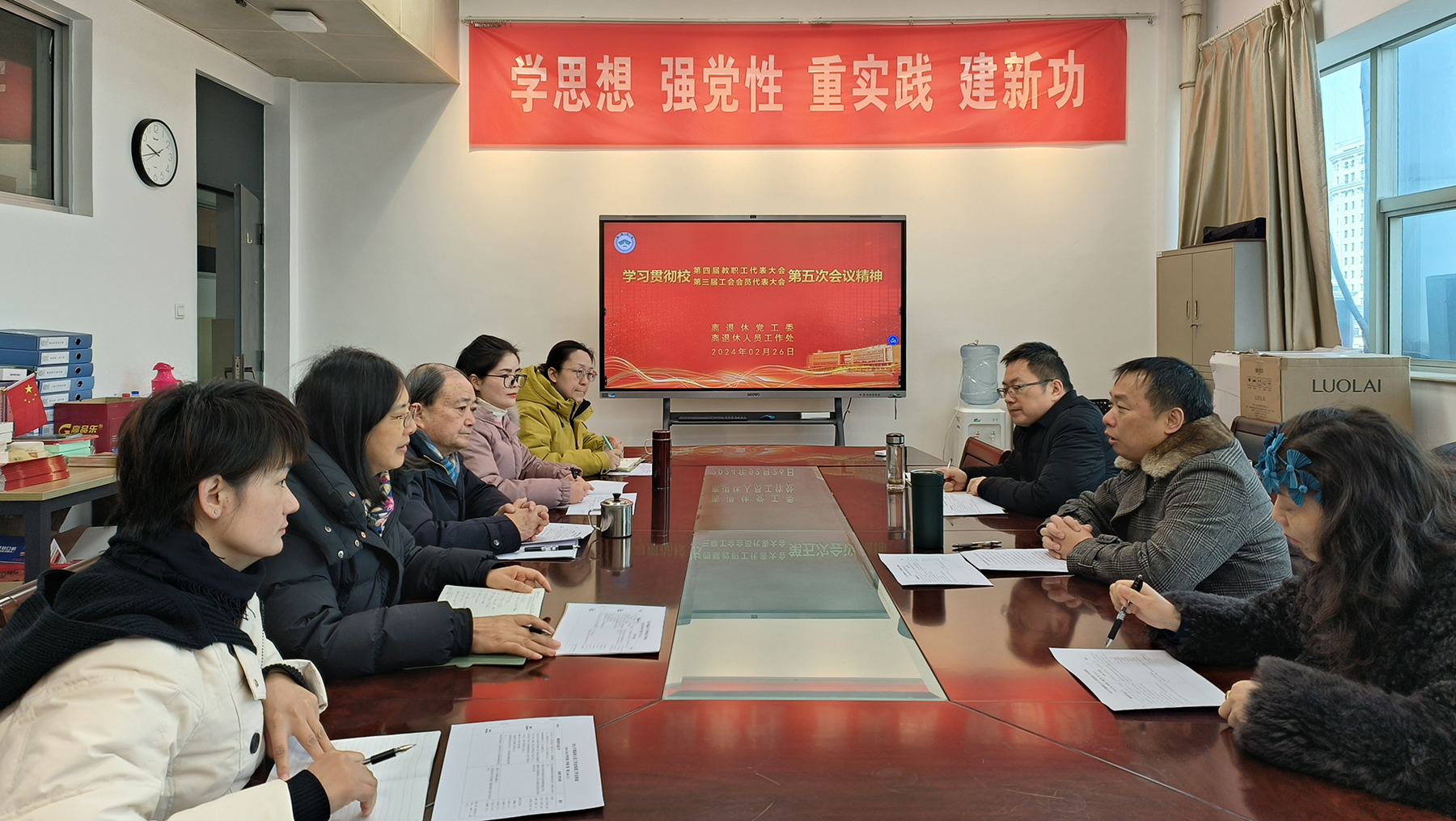 2月26日上午,离退休党工委召开全体人员会议,学习传达校第四届教职工代表大会、第三届工会会员代表大会第五次会议精神,部署新学期重点工作。