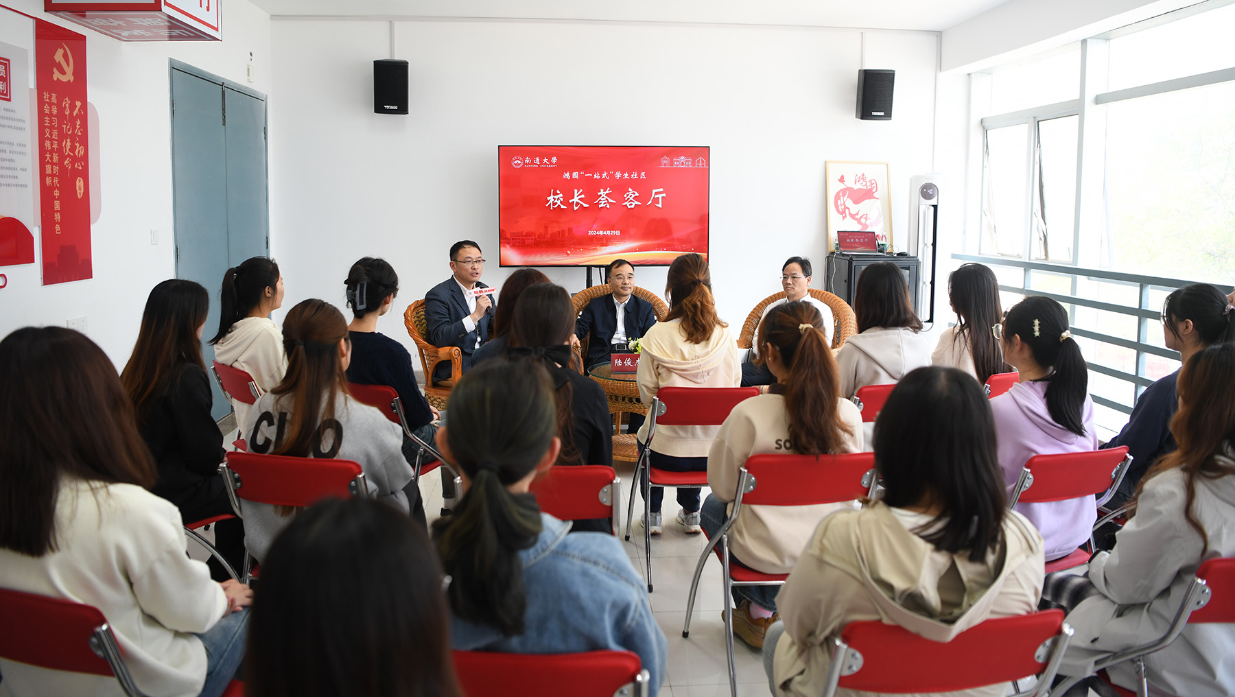 揭牌仪式后,2024年第二期“校长荟客厅”活动在鸿园“一站式”学生社区党建之家举行。陆俊杰、吴如高与鸿园师生代表相聚一堂,倾听师生心声,进行零距离交流谈心。邵春明主持活动。