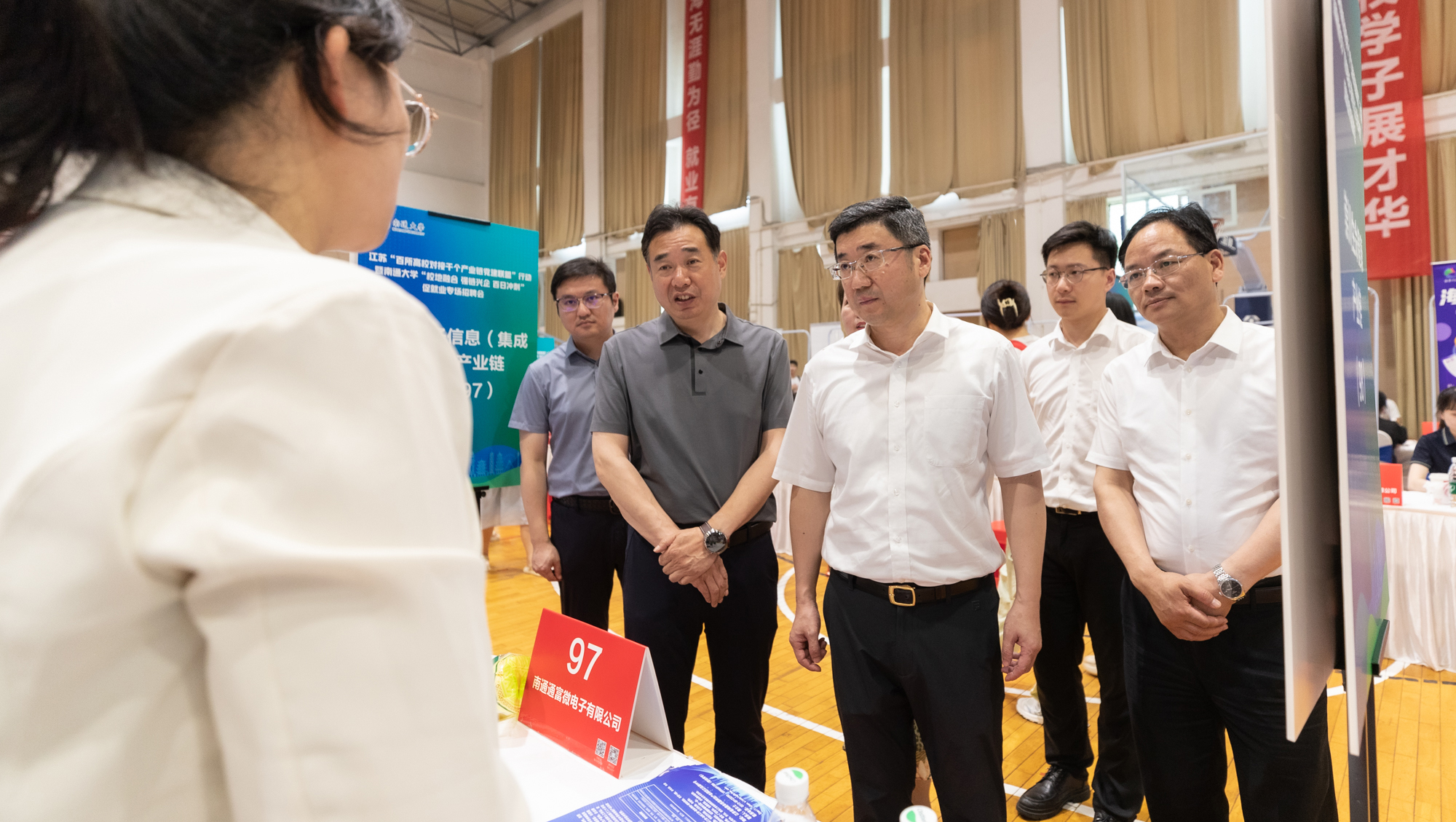 6月20日下午,江苏“百所高校对接千个产业链党建联盟”行动暨南通大学“校地融合 强链兴企 百日冲刺”促就业专场招聘会在我校体育训练馆举办。南通市委组织部副部长陈鹏军,校党委常委、副校长吉明明,校党委常委、组织部部长吴如高来到招聘会现场,了解毕业生与用人单位双选情况。