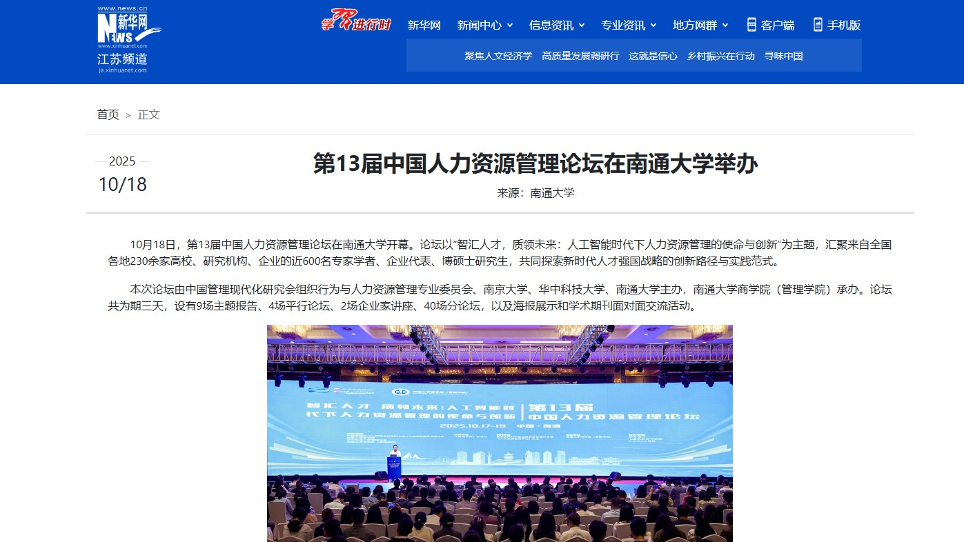 10月18日,新华网以《第13届中国人力资源管理论坛在南通大学举办》为题,报道我校承办的学术论坛。交汇点新闻、南通电视台、南通发布等媒体也进行了报道。