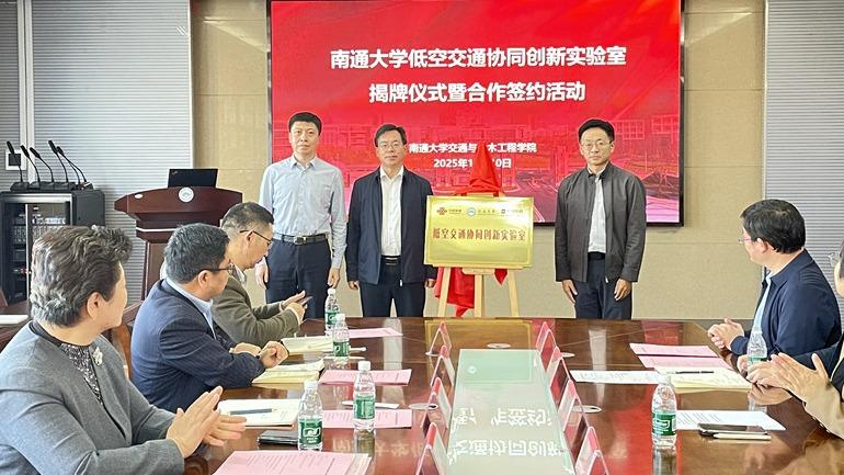 11月10日下午,我校举行低空交通协同创新实验室揭牌仪式。校党委常委、副校长施佺,南通市综合交通运输学会理事长葛玉琴,中国联通智能城市研究院产品研发部总监杜忠岩,北京智网易联科技有限公司董事长吴学军,南通市无人机行业协会会长冯卫东等出席活动并致辞。