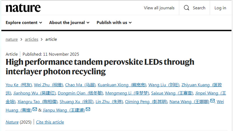 近日,校长王建浦教授作为通讯作者,在Nature发表题为“High performance tandem perovskite LEDs through interlayer photon recycling”的研究论文。
