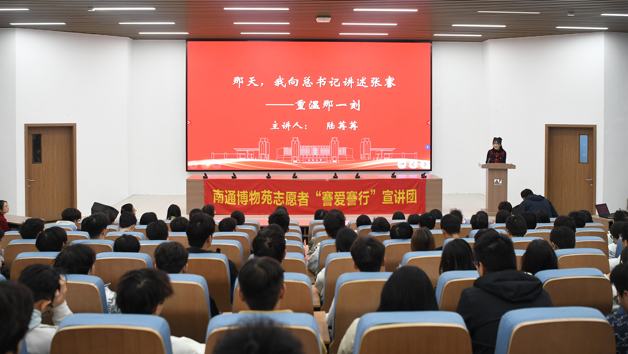 活动中,南通博物苑志愿者“謇爱謇行”宣讲团成员陆苒苒以《那天,我向总书记讲述张謇》为题,回顾了五年前向习近平总书记讲述张謇事迹的激动时刻。她表示,希望通过宣讲让“敢为人先、勇担使命、造福乡梓”的张謇精神在青年学子心中生根发芽,成为照亮他们青春的精神灯塔。她欢迎在场师生多走进南通博物苑,在百年苑囿中感悟历史、汲取力量,同时邀请更多我校学子加入志愿宣讲队伍,用声音传承文脉,用行动践行初心。南通市优秀志愿者、南通博物苑十佳志愿者曹建清以《张謇与中国近代第一城》为题,生动讲述了张謇先生在兴办实业、教育与社会公益方面的卓越贡献,号召广大师生将爱国之情、报国之志融入学习科研与奋斗实践中。智能信息技术研究中心综合办公室主任、南通博物苑志愿者孙琳玲以《百场宣讲守初心 张謇精神永流传》为题,分享了自己十年志愿服务、五年宣讲的心路历程,表示南通大学与南通博物苑同源同根,将携手讲好南通故事、通大故事,让张謇精神在新时代焕发出更加璀璨的光芒。信息科学技术学院“E脉相承”校史宣讲团成员、2024级信息与通信工程专业研究生孟凡迪在发言中表示,将以志愿宣讲的形式,让思想在交流中生根,让信仰在行动中闪光,以青春之力谱写新时代通大学子的奋进篇章。
