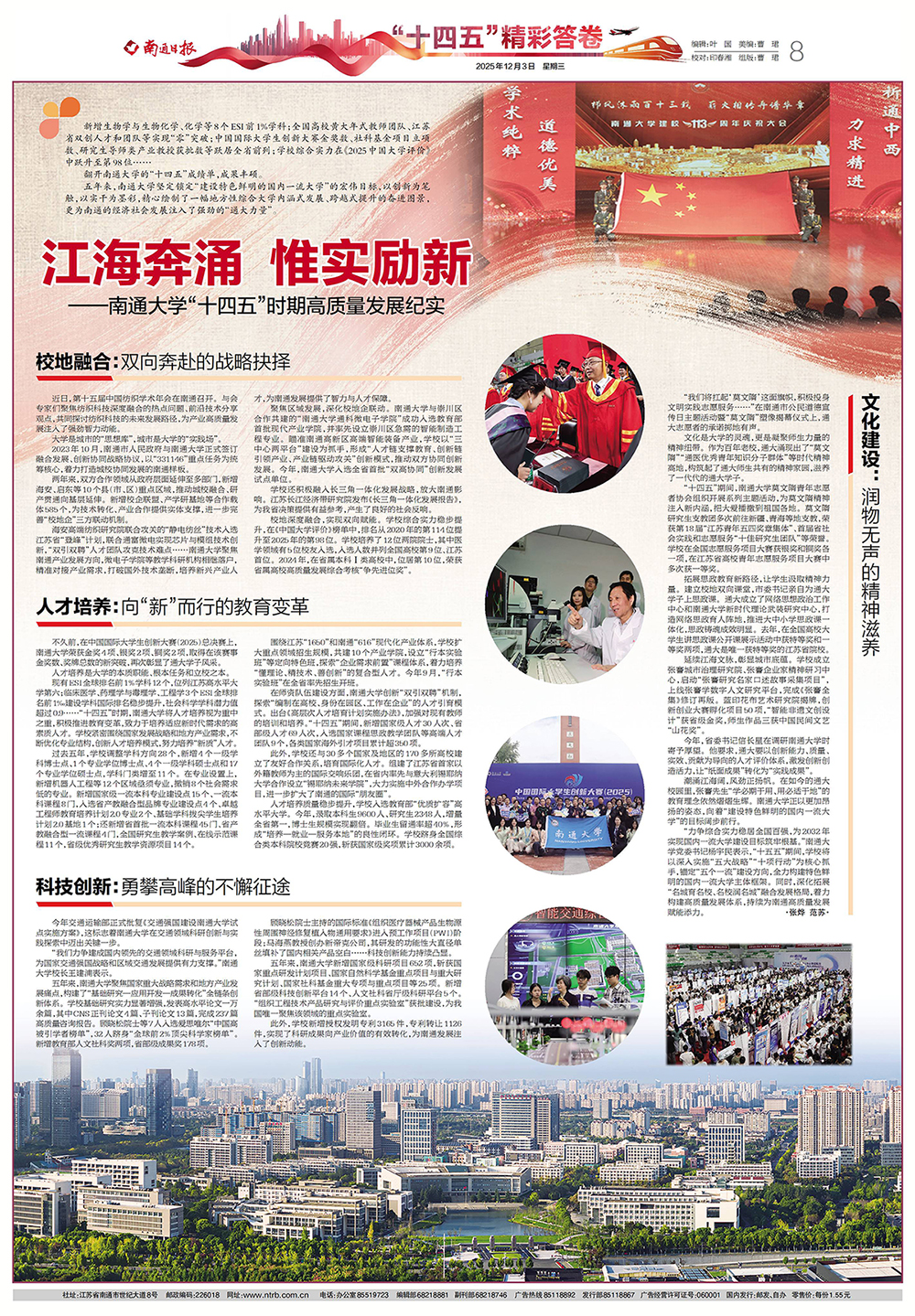 12月3日,《南通日报》整版刊发题为《江海奔涌 惟实励新——南通大学“十四五”时期高质量发展纪实》的报道,聚焦我校“十四五”时期高质量发展成果。