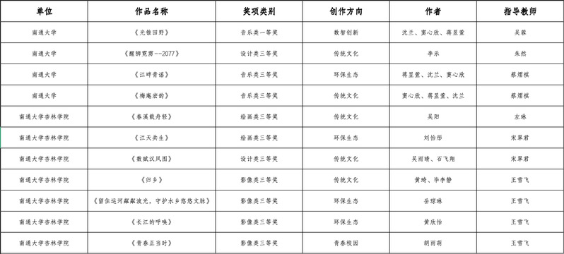 自活动开展以来,我校高度重视、积极组织参与,经学生申报、学院推荐、专家评审,推荐上报各类作品39件。最终,我校选送作品《光锥田野》获音乐类一等奖;《春溪载舟轻》《江天共生》获绘画类三等奖;《醒狮霓雳—2077》《数赋汉风图》获设计类三等奖;《归乡》《留住运河粼粼波光,守护水乡悠悠文脉》《长江的呼唤》《青春正当时》获影像类三等奖;《江畔青谣》《梅庵宏韵》获音乐类三等奖。