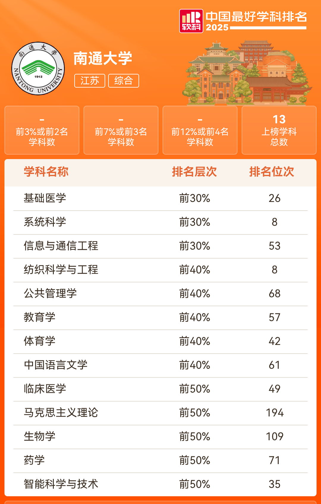 “十四五”以来,我校学科特色优势显著增强,获批2个江苏高校优势学科,8个江苏省重点学科,共有13个学科入榜软科中国最好学科排名榜单,其中基础医学、信息与通信工程排名在同类学科前30%,纺织科学与工程、系统科学排名在同类学科第8名。