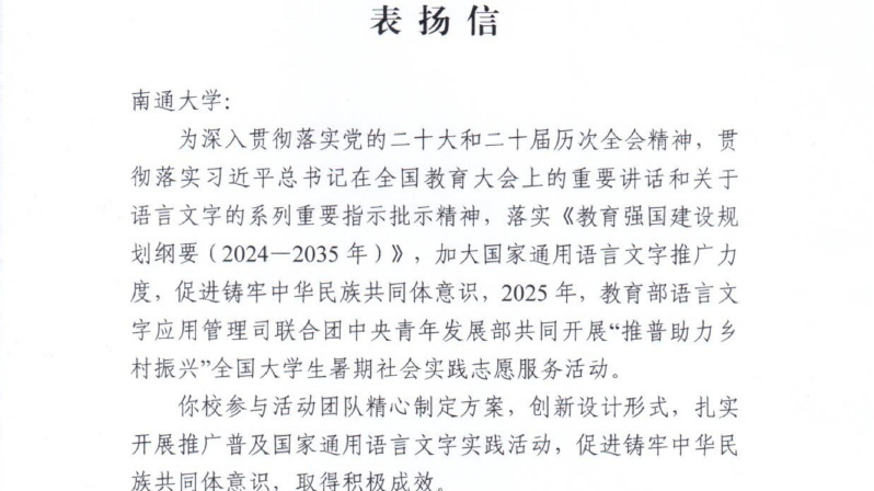 今年暑期,该团队立足国家通用语言文字普及与乡村振兴战略,跨越青海、新疆、贵州、海南,深入多个民族聚居乡村,开展了为期一个半月的扎实调研与精准推普服务。团队紧扣各地实际需求,通过情景短剧演绎、传统民歌改编、实用手册推广等形式,助力不同群体提升语言能力,增强中华语言文化认同与自信。其活动被《中国青年报》、“江苏统一战线”等平台宣传报道。学校将持续深化“推普助力乡村振兴” 品牌建设,打造校地协同的推普示范平台,深化语言赋能乡村振兴的长效机制,鼓励更多通大学子在中国式现代化的广阔舞台上书写青春篇章。