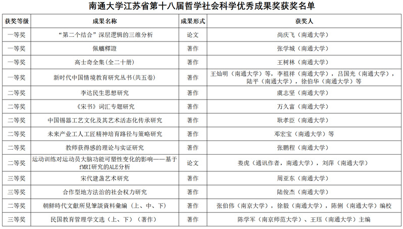 根据江苏省人民政府发布的《省政府关于公布江苏省第十八届哲学社会科学优秀成果奖的决定》(苏政发〔2025〕106号),本届获奖成果中我校获一等奖4项、二等奖7项、三等奖3项,其中一等奖获奖数量仅次于南京师范大学、苏州大学,位列省属高校第3位,创历届最高等级获奖数量新高。我校合并组建以来仅获得一等奖5项,本届实现了历史性突破。