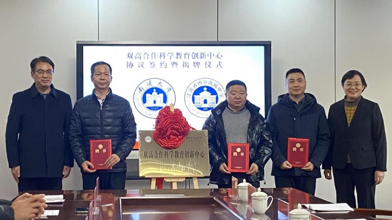 为深化高等教育与基础教育有机衔接,探索创新人才早期发现与贯通培养新路径,1月7日,我校与江苏省西亭高级中学签署双高合作协议书,并举行双高合作科学教育创新中心揭牌仪式。副校长陈玉娟,通州区教体局党组副书记、江苏省西亭高级中学党委书记、校长周岗共同为中心揭牌,并为首批受聘的三位科技导师颁发科技副校长聘书。