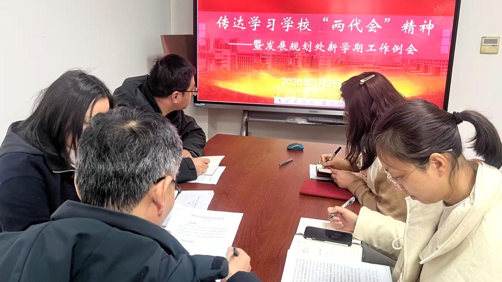 会上,全体人员集中学习了学校“两代会”精神,深刻领会学校发展目标、重点任务与战略举措。与会同志还围绕高质量推进“十五五”规划编制实施、深化校地融合战略、年度目标考核等主题开展交流研讨。大家一致表示,将以校“两代会”精神为指引,立足发展规划处职能定位,主动担当、积极作为,以扎实成效助力学校“十五五”良好开局,为推进特色鲜明国内一流大学建设贡献力量。
