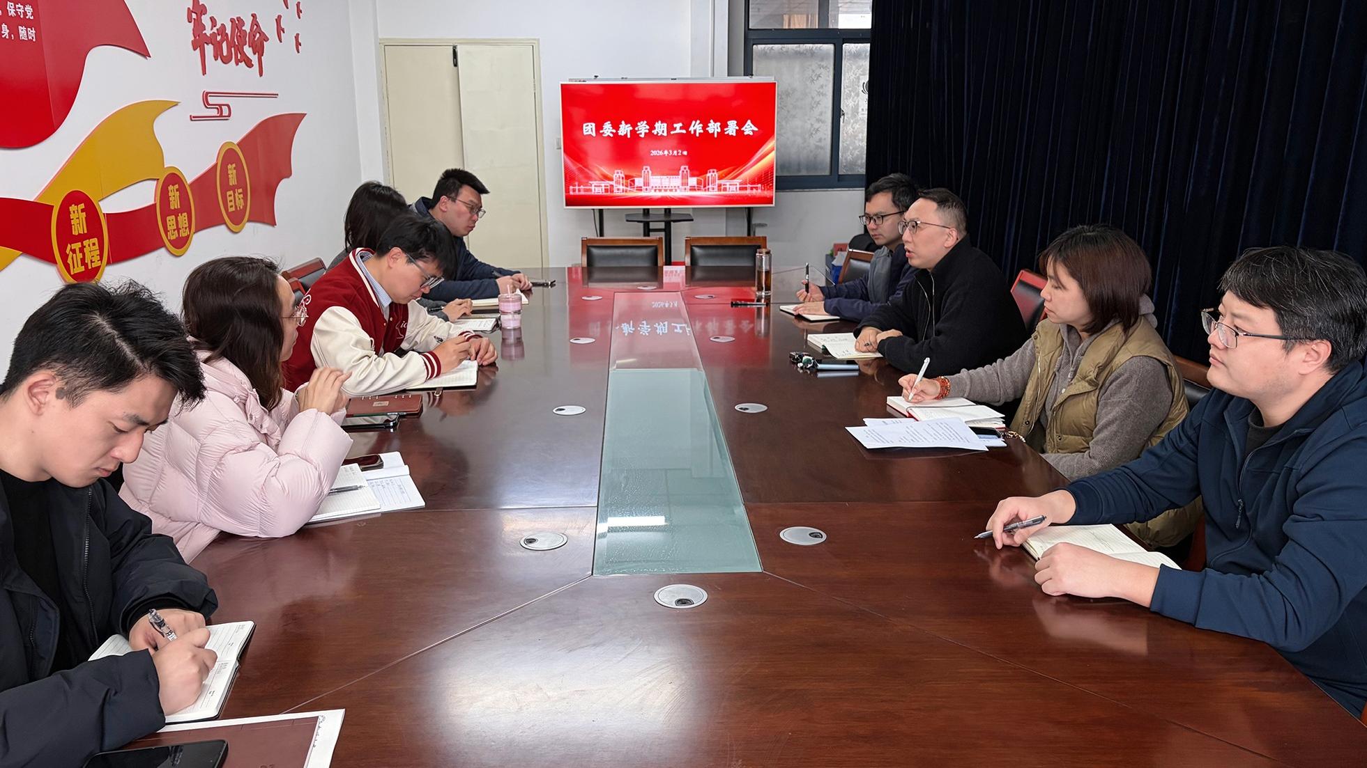 校团委书记施玮传达了校党委书记杨宇民在学校“两代会”上的讲话精神和校长王建浦所作的工作报告精神。他强调,团委全体成员要深刻学习领会、坚决全面贯彻“两代会”精神,准确把握学校发展目标与青年发展需求,务实笃行、奋勇争先,引领广大青年以“走在前、做示范”的担当,共同推动学校共青团事业高质量发展。围绕新学期工作,施玮提出三点要求。一是强化政治引领,以理论武装筑牢思想根基。要把思想和行动统一到学校决策部署上来,在知行合一中提升政治执行力,确保各项工作始终沿着正确方向推进。二是聚焦中心工作,以实干担当服务发展大局。要紧扣学校“十五五”事业发展规划和特色鲜明国内一流大学建设目标,找准共青团融入事业发展的切入点和发力点,在服务高质量发展中展现组织作为。三是锻造过硬队伍,以自身建设提升组织效能。要建强团干部和学生骨干队伍,在从严从实中锤炼政治品格与履职能力,不断提升团组织的引领力、组织力和服务力。