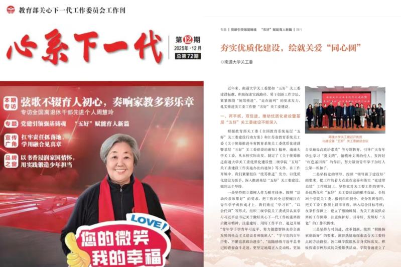 近日,教育部关心下一代工作委员会会刊《心系下一代》2025年第12期刊发了我校关工委《夯实优质化建设,绘就关爱“同心圆”》一文,系统展示了我校关工委围绕全国教育系统基层“五好”关工委建设标准,紧扣“统筹推进、走在前列”工作要求,持续深化实践探索、推进工作创新、提升“五好”创建质效的积极作为。