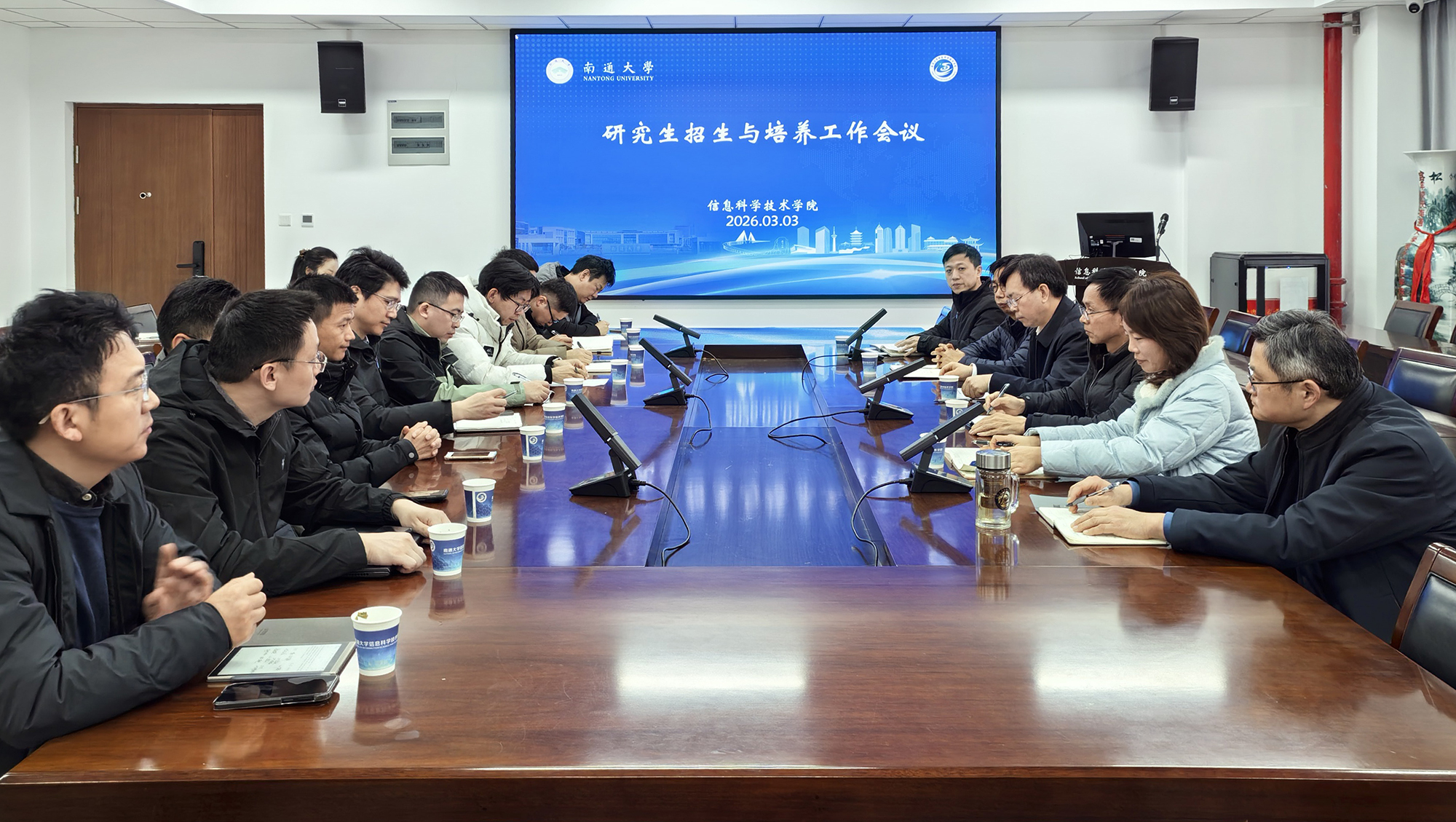 在信息科学技术学院,施佺听取了学院博士研究生招生进展、学位论文管理等方面的专题汇报,对学院研究生教育工作给予肯定,并就下一步工作提出明确要求。一是找准区位优势,在生源质量上求突破。充分利用学校独特的区位优势和南通产业资源,通过本硕贯通、校企宣介等方式,吸引本校优质生源留校深造,同时加大宣传力度,积极拓展周边省市优质生源。二是坚持分类施策,在培养路径上求精进。推动学术学位与专业学位双轨并进,分类制定培养方案与评价标准,学术型重理论创新,专业型重实践应用,让不同类型研究生各展所长、各成其才。三是深化产教融合,在协同育人上闯新路。积极与行业龙头企业共建联合培养基地,推行“校内导师+产业导师”双导师制,推动研究生深度参与一线课题,在校企双循环中提升工程实践与系统集成能力,让研究生在真环境中研究真问题。四是强化内涵建设,在学科特色上再聚焦。集中资源打造特色研究方向,围绕方向配置导师资源、布局科研平台,努力构建“方向—团队—平台—成果”四位一体的培养链条。施佺强调,全体导师要恪守育人初心,把论文写在祖国大地上,把成果应用在现代化建设实践中,为学校建设特色鲜明的国内一流大学贡献智慧和力量。会上,研究生院副院长赵静结合研究生培养和2026年研究生报考情况,就进一步加强研究生招生及导师队伍建设提出建议。