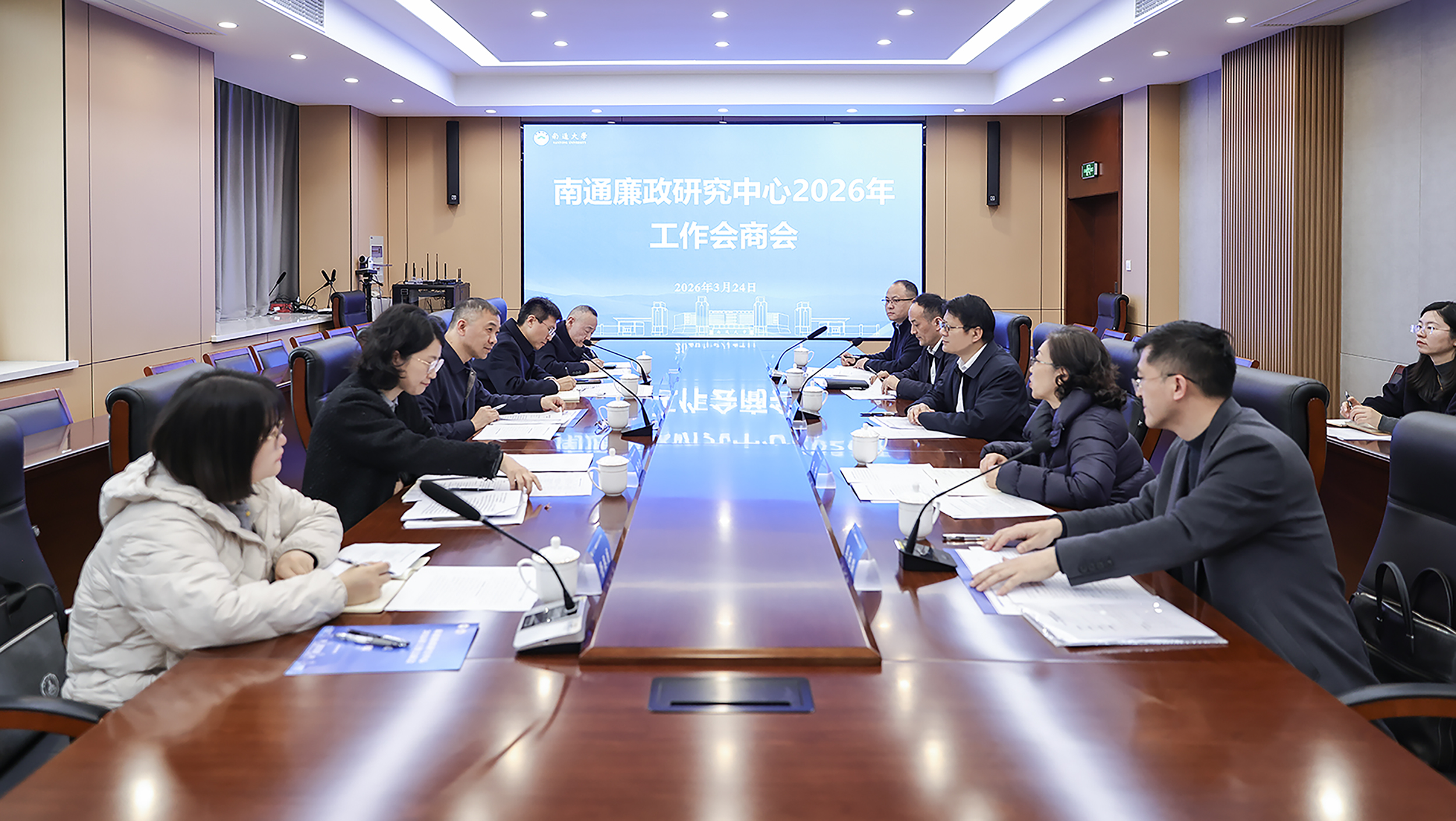 3月24日下午,南通廉政研究中心召开2026年工作会商会。校党委常委、纪委书记、派驻监察专员、南通廉政研究中心主任周振修,南通市纪委副书记、监委副主任陈德军出席会议并讲话。南通市纪委常委、秘书长陈四维主持会议。