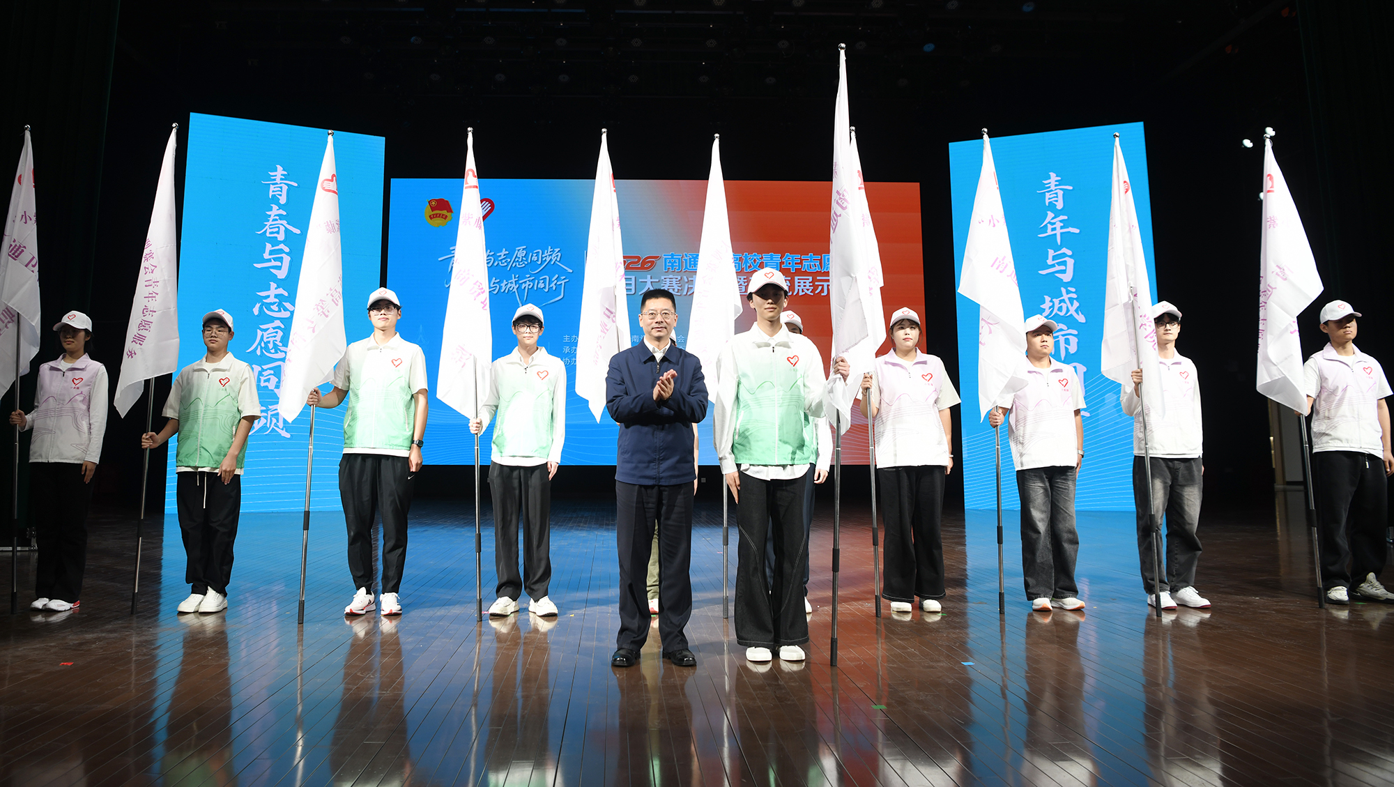 3月26日,2026南通市高校青年志愿服务项目大赛决赛暨项目交流展示活动在我校啬园校区举行。现场发布关于大学生参与“垃圾分类”志愿服务的倡议,并举办“小紫藤”苏超志愿者出征仪式。南通市委常委、组织部部长倪春青为“小紫藤”青年志愿服务队授总旗。校党委常委、副校长吉明明代表学校致辞。中国青年报社党委委员、编委兼共青团新闻中心主任黄勇,南通市慈善联合总会副会长顾晓明,南通团市委书记曹铖出席活动。