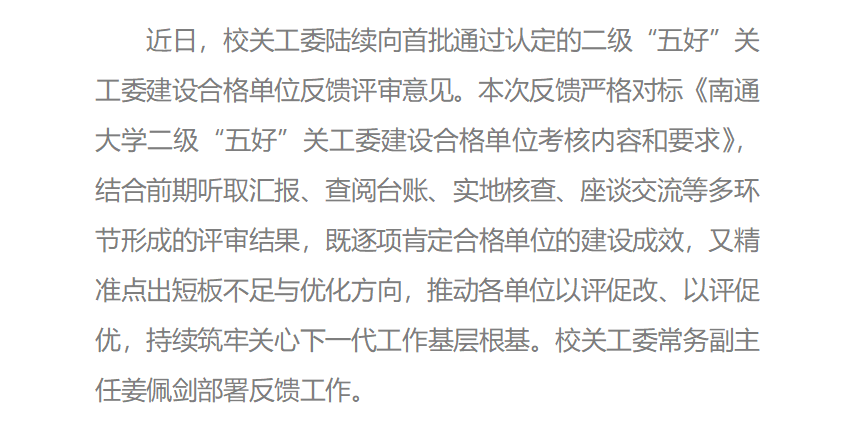 近日,校关工委陆续向首批通过认定的二级“五好”关工委建设合格单位反馈评审意见。校原总会计师、关工委常务副主任姜佩剑部署反馈工作。本次反馈严格对标《南通大学二级“五好”关工委建设合格单位考核内容和要求》,结合前期听取汇报、查阅台账、实地核查、座谈交流等多环节形成的评审结果,既逐项肯定合格单位的建设成效,又精准点出短板不足与优化方向,推动各单位以评促改、以评促优,持续筑牢关心下一代工作基层根基。从评审情况来看,各参评单位已普遍形成“组织健全、制度完善、工作扎实、特色鲜明”的良好态势,顺利达成领导班子配置到位、“五老”队伍作用凸显、制度机制有效运转、活动开展常态化的建设目标,关心下一代工作基础不断夯