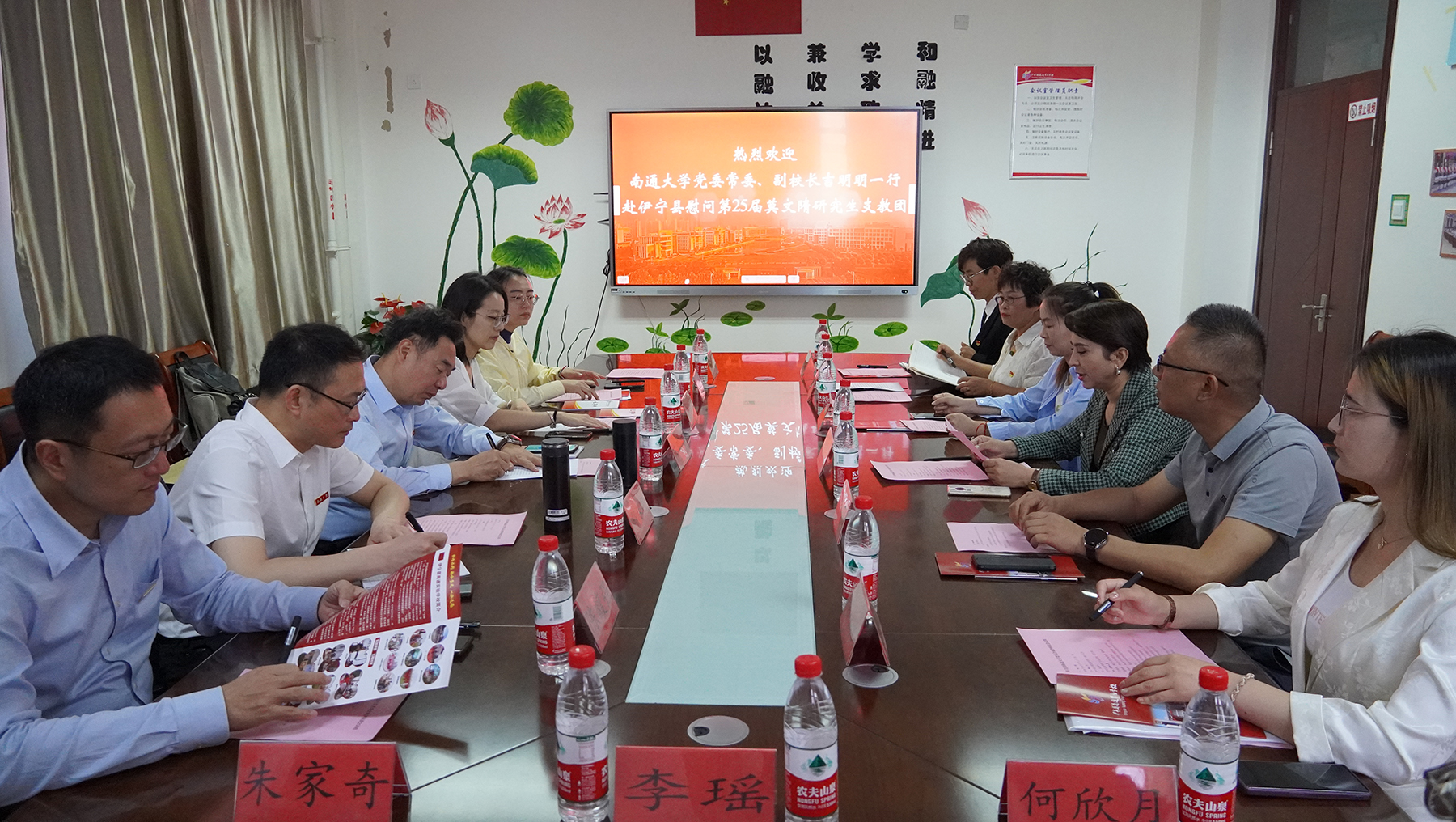 6月4日—5日,校党委常委、副校长吉明明率队赴新疆,看望慰问我校第25届莫文隋研支团在伊宁县南通实验学校支教的学生,给他们送去关怀和温暖。伊宁县委副书记、南通援疆工作组组长施张范,县委常委古拉扎依·艾尔肯,县委常委、政府副县长、南通援疆工作组副组长杨永辉及团县委、教育局负责人陪同看望。吉明明一行先后参观了伊宁县南通实验学校的教学楼、校史馆、阅览室、和通长廊、功能教室,现场观看了和静社团的结课表演,详细了解校园环境、基础设施建设、师资力量、教学教研和学生培养情况,并与伊宁县南通实验学校党总支书记王良云共同为“莫文隋图书角”揭牌。在随后召开的研支团工作座谈会上,吉明明在观看了支教视频后,用“骄傲”“感谢”“传承”三个词表达了对研支团在伊宁县南通实验学校开展工作的体会:一是为研支团成员敢于选择、勇于挑战,克服重重困难用心用情做好支教工作深感骄傲;二是为伊宁县一直以来对我校莫文隋研支团的关心、支持和帮助表示感谢;三是希望一届届莫文隋研支团扎根西部、奉献青春,以实际行动传承“莫文隋”精神,努力架好通伊两地的桥梁。校团委书记陈婷婷详细介绍了我校组织第26届研支团新疆分队成员岗前培训等情况,表示学校