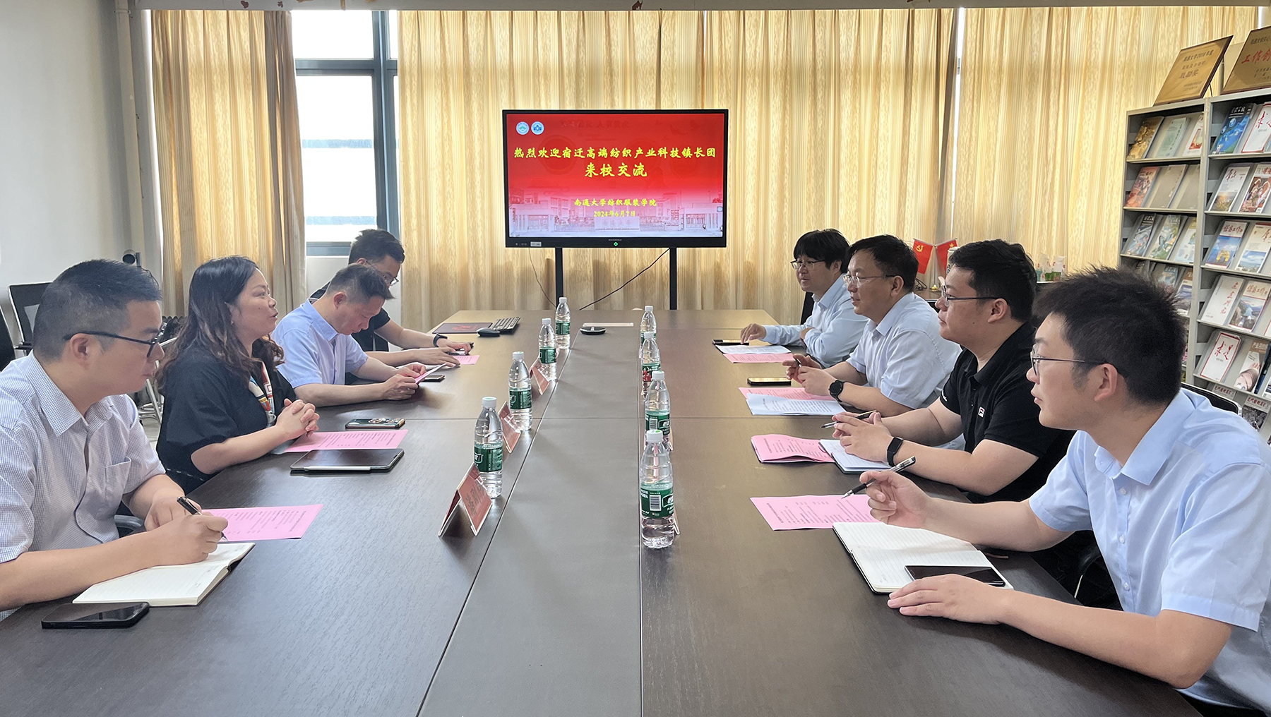 6月7日,沭阳县副县长、宿迁高端纺织产业科技镇长团团长朱晓翔一行来校调研交流。纺织服装学院党委书记刘其霞对朱晓翔一行来访表示热烈欢迎,并简要介绍了学院基本情况。她表示,学院在学校的指导下,始终坚持以服务国家和区域发展战略需求为导向,高度重视并积极支持科技镇长团工作,积极承担服务区域经济社会发展的责任。她希望双方以科技镇长团为桥梁,聚焦纺织行业高质量发展,进一步加强校地协同发展,推动更多优秀科技成果落地转化。朱晓翔感谢南通大学以及纺织服装学院对宿迁高端纺织产业科技镇长团工作的大力支持,简要介绍了沭阳县经济社会发展和科技镇长团的相关情况,高度评价了科技镇长团成员、纺织服装学院麻伍军副教授在科技镇长团开展的工作成效。他期待与南通大学进一步加强交流合作,促进地方和高校共赢发展。麻伍军详细汇报了挂职工作开展情况,表示将结合自身的专业优势、校地双方的资源优势,促进我校与地方企业之间的交流与合作,为服务地方经济发展、加强校地互动、推动学校事业发展贡献力量。会上,双方围绕高端纺织产业发展、高层次人才创新创业项目招引以及第十七批科技镇长团选派人员等进行了深入交流。在校期间,朱晓翔一行参观了范曾艺术馆、安