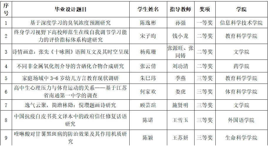近日,省教育厅公布了2023年度江苏省普通高校本科优秀毕业论文(设计)评选结果。我校获省优秀毕业论文(设计)单篇一等奖1项、二等奖3项、三等奖12项,获省优秀团队毕业论文(设计)3项。近年来,我校高度重视本科毕业论文(设计)工作,持续强化本科毕业论文(设计)工作的顶层设计和系统谋划,加强毕业论文全程信息化管理,通过智能管理系统对毕业论文(设计)选题、开题、中期汇报与检查、格式检查、定稿查重、评阅、答辩等全过程进行在线监督管理,并定期对指导教师和学生组织毕业论文(设计)指导、撰写与学术规范等专题培训。同时,学校严格贯彻落实教育部本科毕业论文(设计)抽检要求,常态化组织毕业论文(设计)校内抽检,引导各学院规范和加强本科毕业论文(设计)质量管理,提高本科学位论文质量,进一步健全本科人才培养质量保障体系。(米玉秀)