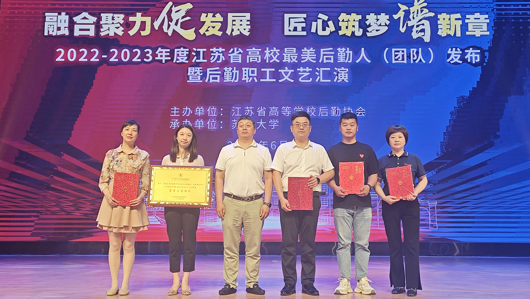 6月2日,江苏省高校后勤协会“2022-2023年度最美后勤人(团队)”表彰大会暨后勤职工文艺汇演在苏州大学举行,我校公寓服务中心生活辅导员司琳、饮食服务中心米饭生产线班组长赵程、交通服务中心驾驶员关明全荣获“最美后勤人”称号,公共卫生管理科、医疗服务中心荣获“最美后勤团队”称号。司琳同志始终秉持“育人为本、德育为先”宗旨,从生活辅导到学生身心健康,从日常管理到疫情防控,尽心尽力做好每一项工作,用心用情关爱学生成长成才,在平凡的工作岗位上书写了不平凡的工作业绩,用实际行动彰显了高校后勤人的大爱奉献。赵程同志2013年到学校食堂工作,负责的米饭生产线为4万余师生稳定地提供米饭供应,从未出现任何纰漏,诠释了劳动者默默无闻、无私奉献的爱岗敬业精神。关明全同志虽然没有惊天动地的光辉业绩,却在驾驶员这一平凡的岗位上任劳任怨、勤勤恳恳,用自己的实际行动践行着“行车万里,安全第一”的宗旨。公共卫生管理科和医疗服务中心团队作为校园健康的守护者、师生眼中的娘子军团,在保障服务中坚守尽责、甘于奉献,聚力而行、向阳而生,只为守护校园师生健康,彰显着医务工作者的责任与担当。“2022-2023年度最美后勤人(