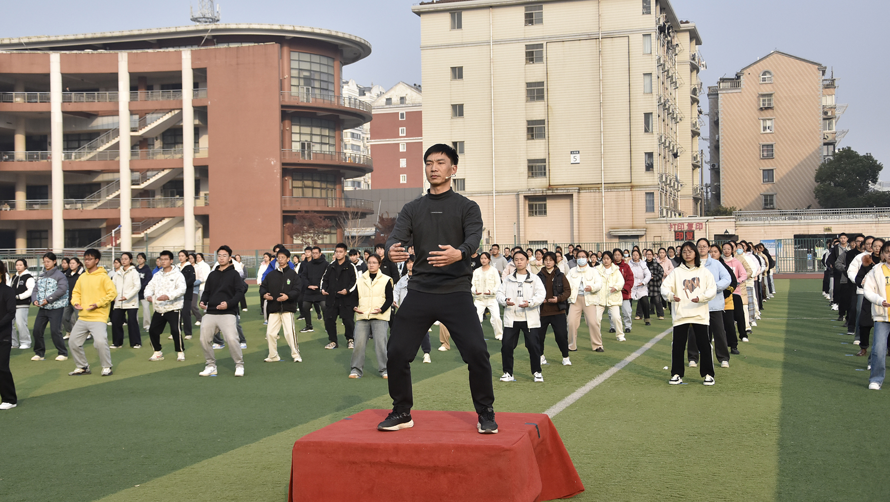 12月6日下午,我校在启秀校区操场举办“阳光体育 活力健心 你我同行”八段锦养身健心活动。学生工作部部长张雪松出席活动。张雪松指出,培养学生积极向上、乐观平和的阳光心态是心理健康教育的重要目标,美育润心和体育健心是心理健康教育活动的重要法宝,本次的八段锦学习演练是我校推出的艺体健心系列活动的重要组成部分。八段锦健身活动将简便易行、强身健体的保健运动引入学生日常学习生活,既能引导学生走下网络、走出宿舍、走出教室、走进操场,又能帮助学生在紧张的学习之余放松身心,以更为充沛的精力、更加健康的体魄迎接各类挑战。同时,这样的活动也让更多的学生了解健身活动,增强健康意识,在全校营造全员参与养身健心的良好氛围。体育科学学院院长助理卢伯春向同学们详细讲解了八段锦各式的动作要领和注意事项,体育科学学院学生在现场对参与同学的动作进行了示范和纠正。随后,现场同学在卢伯春的带领下共同演练八段锦。同学们纷纷表示,医学学习内容多、时间紧、压力大,尤其临近期末,很长时间浸泡在教室、图书馆,身体经常处于紧崩状态,八段锦的练习对于放松身体、恢复自身的精气神有很大帮助,在今天的活动后会继续练习八段锦,强身健心,以更好的状