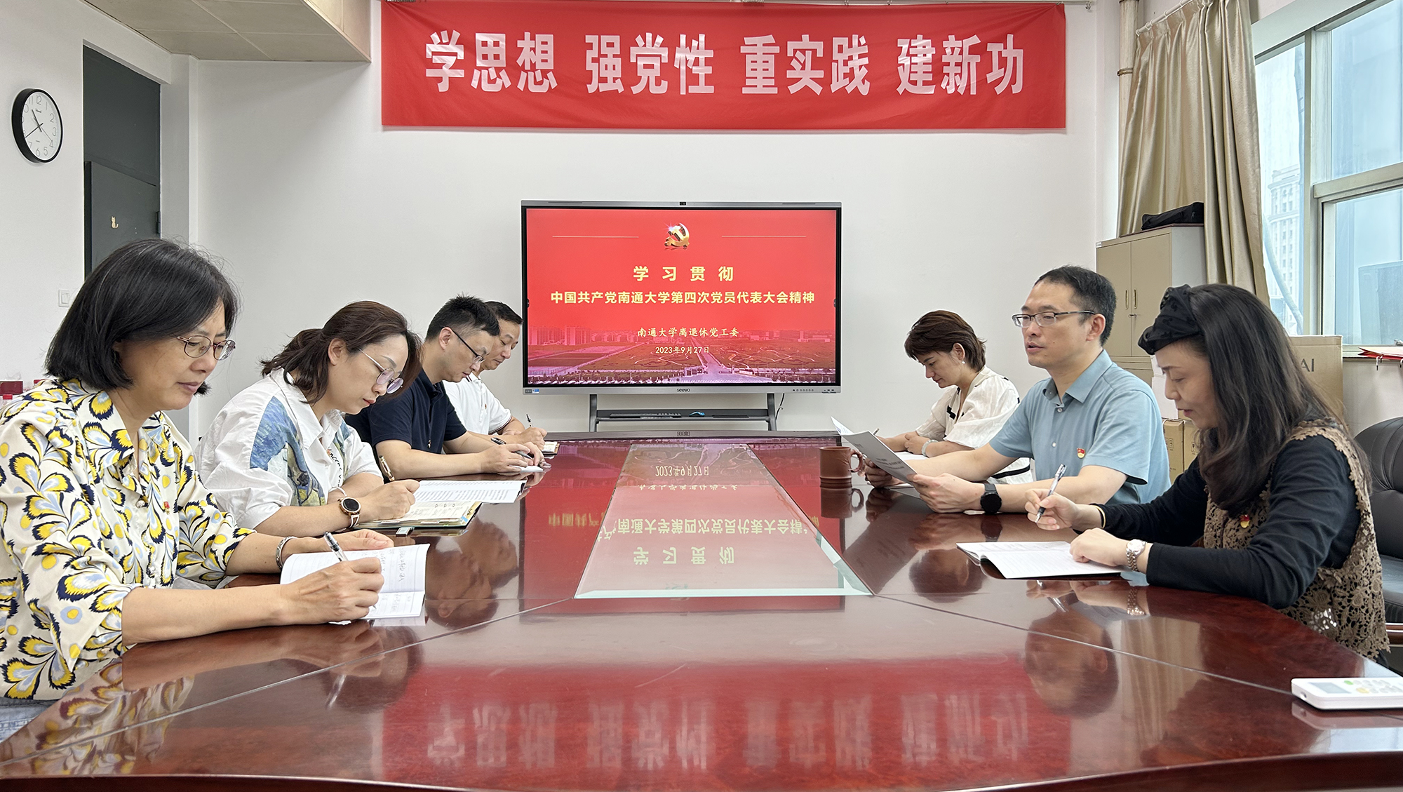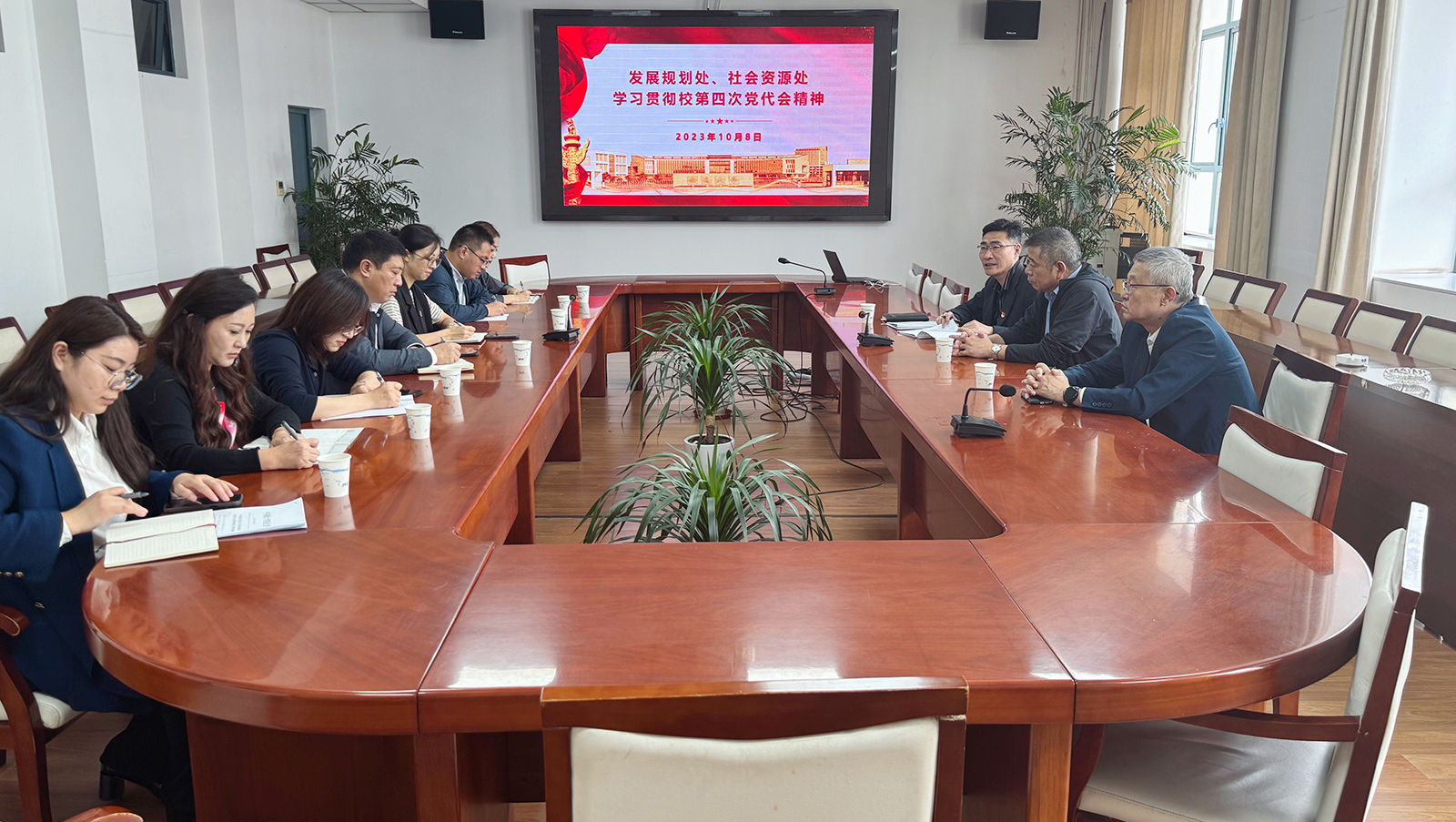 发展规划处、社会资源处学习贯彻校第四次党代会精神10月8日上午,发展规划处、社会资源处召开专题会议,学习贯彻校第四次党代会精神。社会资源处处长岳泳主持会议。发展规划处处长朱广华传达并带领全体人员学习了校党委书记尚庆飞题为《凝心聚力 勇毅前行 为全面建设特色鲜明的国内一流大学而努力奋斗》的党委报告。岳泳传达了校纪委《坚定不移推进全面从严治党 为早日建成特色鲜明的国内一流大学提供坚强保障》的工作报告。会上,大家围绕学校提出的“五大战略”和“十大行动”,立足部门的中心工作,就如何主动适应新形势、新要求,在学校全面开启建设特色鲜明的国内一流大学的新征程中贡献智慧和力量开展了讨论。大家一致认为,一要加强学习,准确把握第四次党代会精神的重大意义和丰富内涵,胸怀大局,以奋进的姿态开启新征程;二要提升能力,深度挖掘部门工作的发展潜力,融会贯通,力争在新赛道上跑出“加速度”;三要狠抓落实,将机遇和优势转化为发展动能,凝聚合力,奋力开创学校高质量发展新局面。发展规划处、社会资源处全体人员参加会议。(陈会萍/文 陆楠/摄)医学部党支部传达学习校第四次党代会精神10月7日上午,医学部党支部召开专题学习会,传达