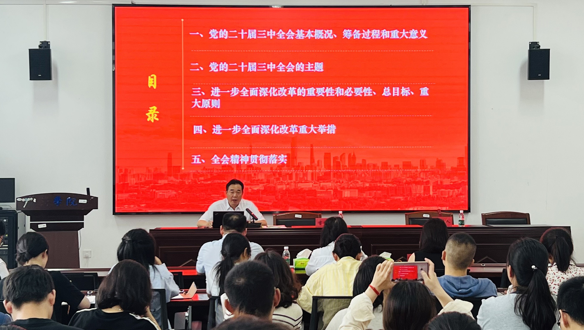 特种医学研究院召开党的二十届三中全会精神学习会9月25日下午,特种医学研究院召开全体党员大会,集中学习党的二十届三中全会精神。南通市委宣讲团成员、校党委常委、副校长吉明明作宣讲报告。吉明明以《进一步全面深化改革 推进中国式现代化》为题,围绕牢牢把握党的二十届三中全会基本概况和重大意义、全会主题、进一步全面深化改革的重要性必要性与重大原则、进一步全面深化改革的重大举措和全力以赴抓好全会精神贯彻落实等五个方面,进行系统阐述和深入解读。他指出,党的二十届三中全会是新的历史起点上进一步全面深化改革、推进中国式现代化的总动员、总部署。深入学习贯彻这次全会精神,是当前和今后一个时期全党全国的一项重大政治任