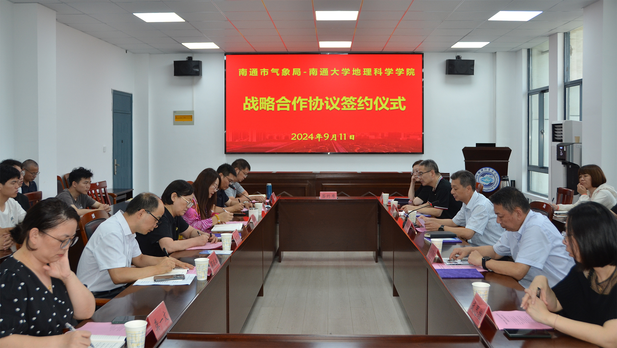 9月11日下午,地理科学学院与南通市气象局举行战略合作协议签约仪式。副校长陈玉娟出席仪式并讲话。陈玉娟介绍了我校的办学历史和发展成就,希望双方以本次合作协议的签订为契机,同向发力、携手共进,不断取得新的合作成果,努力形成优势互补、合作双赢的良好局面,为推进气象工作现代化、服务地方经济社会发展作出更大贡献。南通市气象局党组书记、局长严迎春介绍了南通市气象事业的发展史和工作进展,表示南通市气象局与南通大学地理科学学院研究对象耦合互补,发展方向高度契合,合作空间巨大。他表示,双方要以本次合作协议的签订为起点,推进资源共享,共同培养高素质复合型人才;加强学科融合,共同培育和发展新质生产力;双向融合赋能