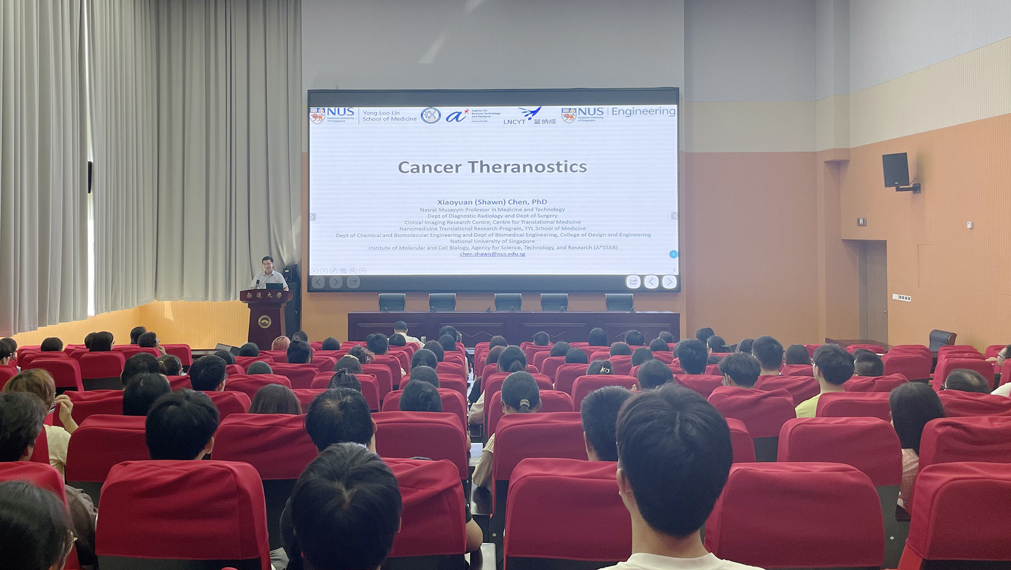9月9日下午,新加坡国立大学终身讲席教授陈小元应药学院邀请来校作学术报告。校党委常委、纪委书记、派驻监察专员周振修主持报告会。200余名师生到会聆听报告。陈小元教授以《Cancer Theranostics》为题,从核素偶联药物入手,详细介绍了核素药物研发过程,以及基因/药物的纳米载体在多种肿瘤中的诊断和治疗应用,分享了自己对纳米药物最新研究进展和未来发展方向。他指出,在癌症治疗中,纳米医学能通过纳米技术的精准递送、靶向治疗和联合治疗等手段,提高疾病治疗效果,减少副作用,为患者带来更好的治疗体验和预后。此外,除了癌症治疗,纳米医学在心血管、神经系统、艾滋病、糖尿病及多种炎症性疾病的治疗中也展现