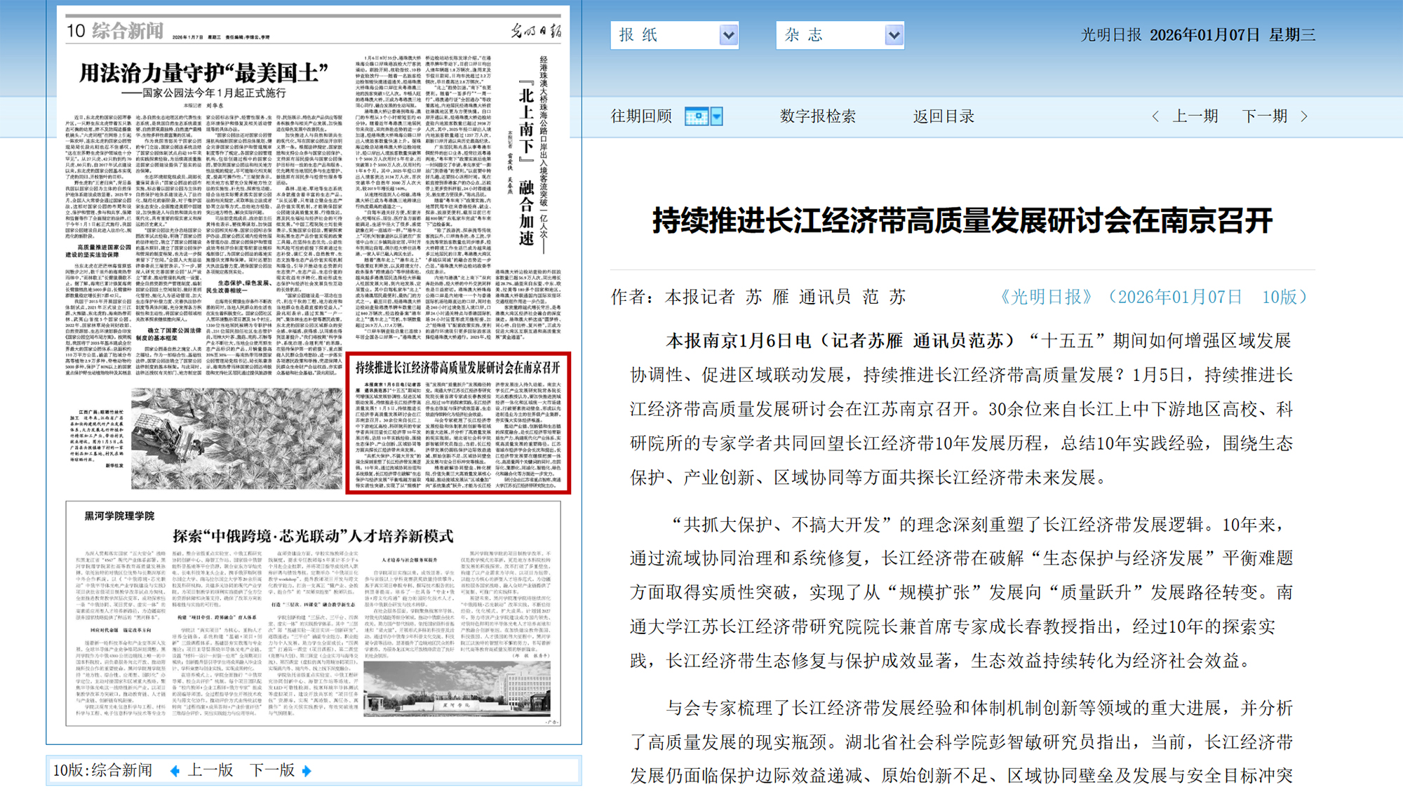 1月4日,中央电视台《焦点访谈》栏目播出《新时代长江之歌 十年守护 见证绿色蝶变》节目,就长江大保护工作采访我校理论研究基地学术委员会副主任、江苏长江经济带研究院院长兼首席专家成长春教授。成长春指出,生态优先强调生态保护的重要性,它的最终目的就是促进经济社会发展的全面绿色转型。他表示,长江经济带“共抓大保护、不搞大开发”的推动,不仅仅给我们沿江的城市带来了生态效益,更重要的是从经济社会的全面绿色转型入手,推动了整个经济社会的全面发展。(杨淑霭)相关链接:央视新闻https://content-static.cctvnews.cctv.com/snow-book/video.html?item_